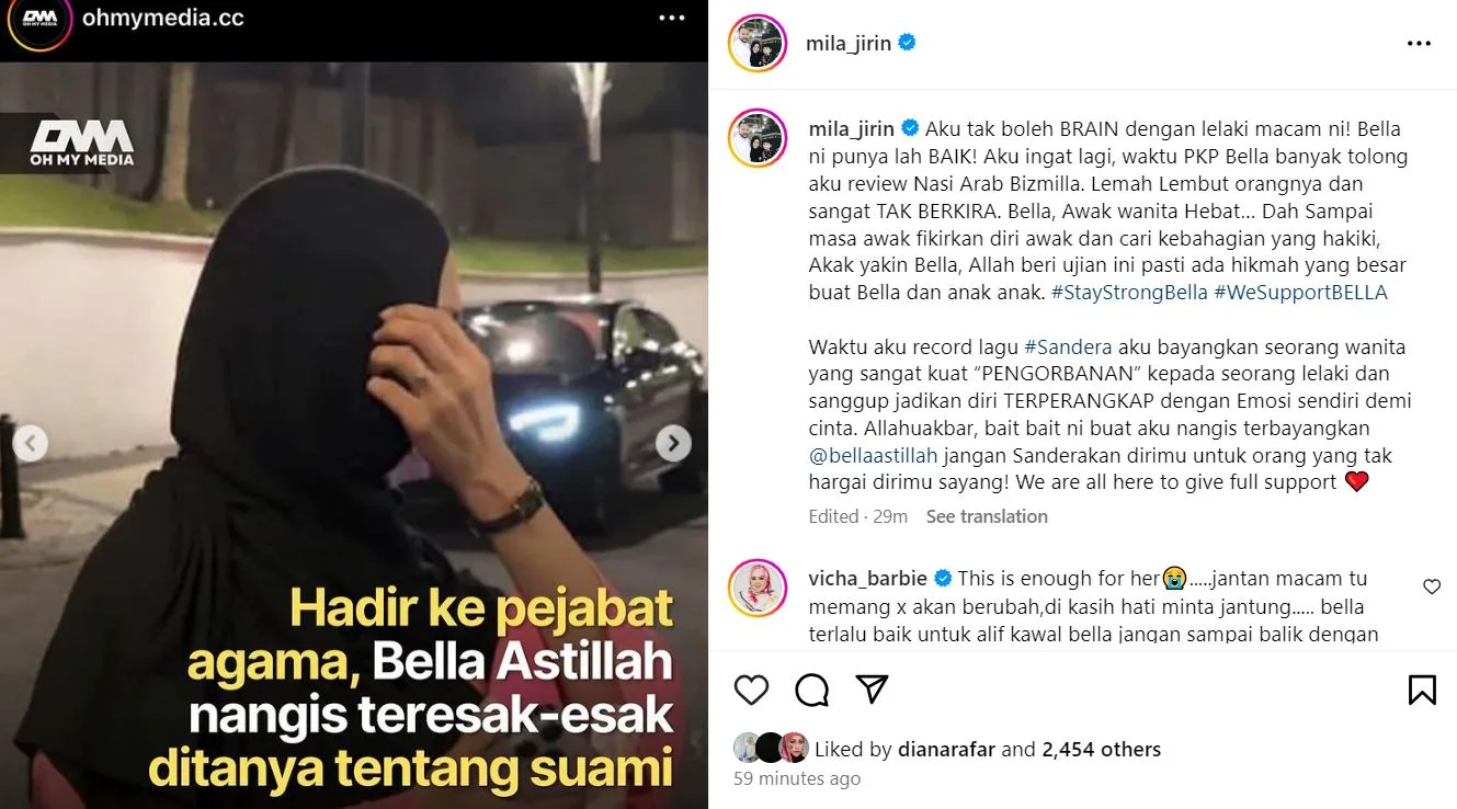 Salah seorang yang turut bersuara mengenai isu ini adalah penyanyi Mila Jirin. Di Instagram, Mila Jirin seolah-olah menzahirkan perasaan geramnya dengan situasi yang terjadi kepada Bella.