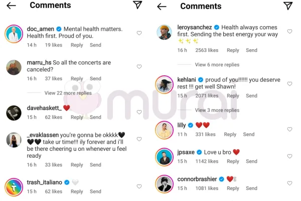 Murai MY menjengah ke akaun Instagram milik penyanyi berbakat ini dan mendapati Shawn membuat keputusan untuk menangguhkan tarikh konsert jelajahnya demi memberi ruang untuk dirinya mendapatkan rawatan profesional.