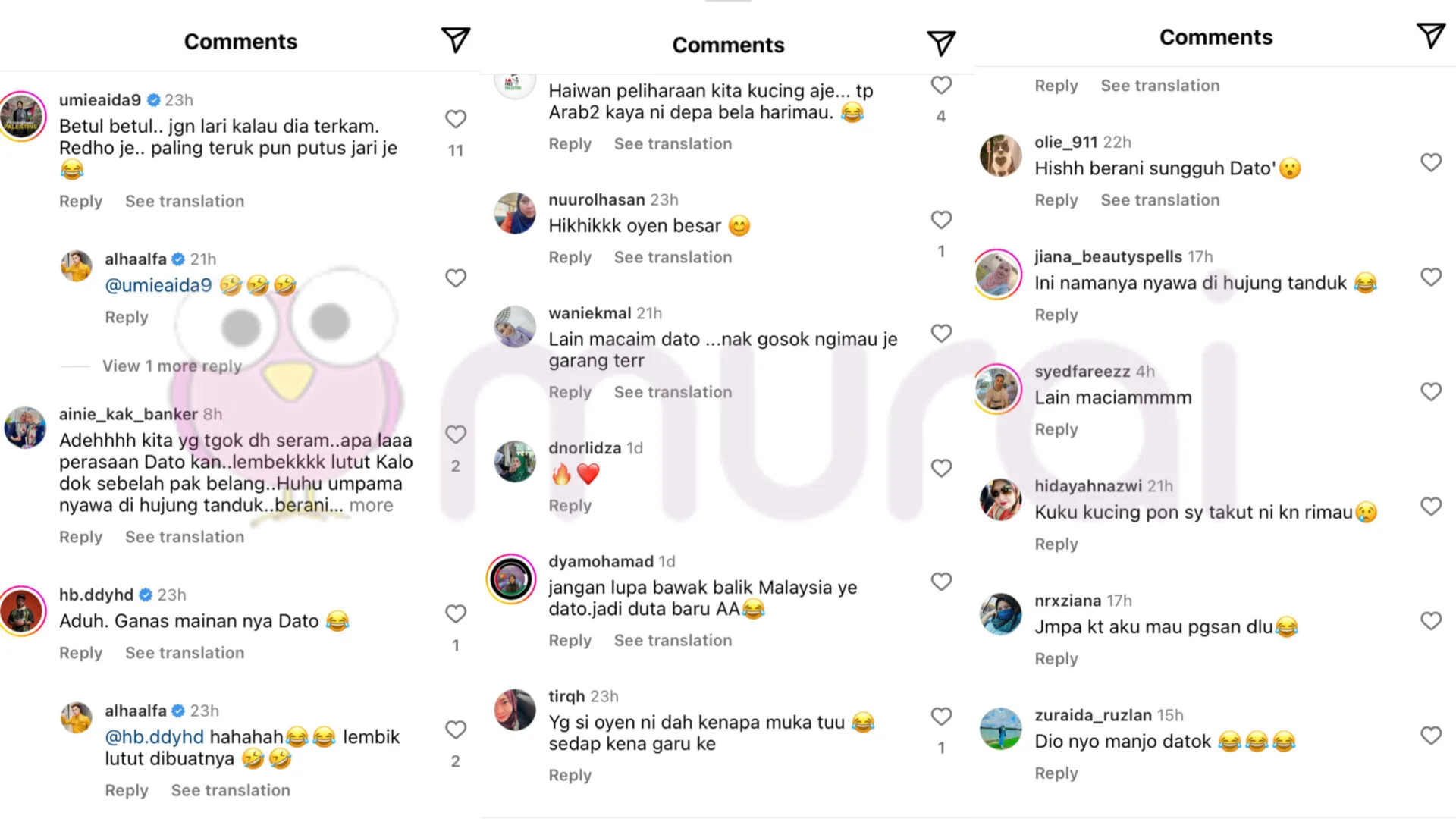 Rata-rata netizen di ruangan komen memberikan pelbagai reaksi mereka, malah ada yang ‘seram’ melihat usahawan kosmetik ini sangat berani untuk membelai dan bergambar dengan haiwan pemangsa.
