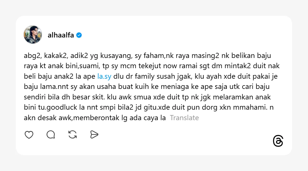 Kalau awak semua takde duit tapi nak juga melaramkan anak bini tu, goodluck la nanti sampai bila-bila jadi gitu. Takde duit pun diorang takkan memahami dan akan mendesak awak, memberontak lagi ada, percaya laa.”-tulis Alha Alfa di Threads