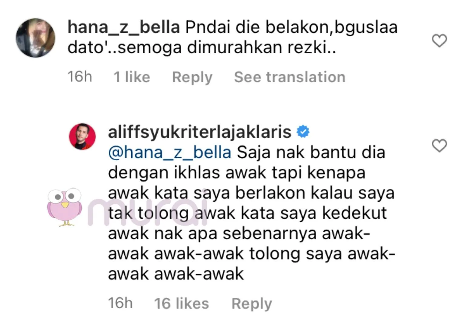 “Saya nak bantu dia dengan ikhlas tapi kenapa awak kata saya berlakon. Kalau saya tak tolong, awak kata saya kedekut. Awak nak apa sebenarnya.”-Komen Aliff Syukri