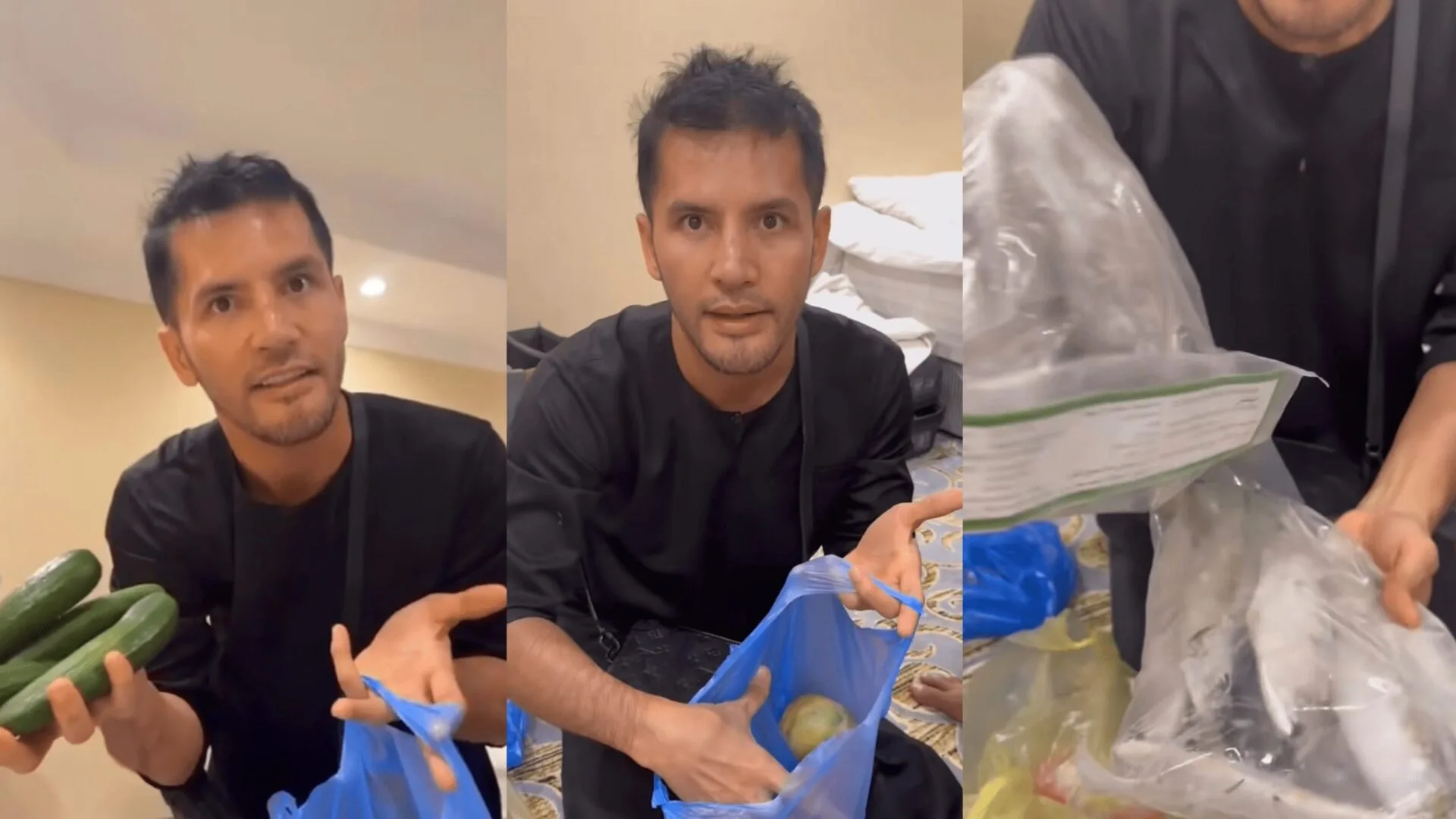 Aliff Syukri menunjukkan lagi barangan yang dibelinya. Termasuklah ikan yang berharga RM150, katanya jika di Malaysia, ikan tersebut dalam RM30 sahaja.