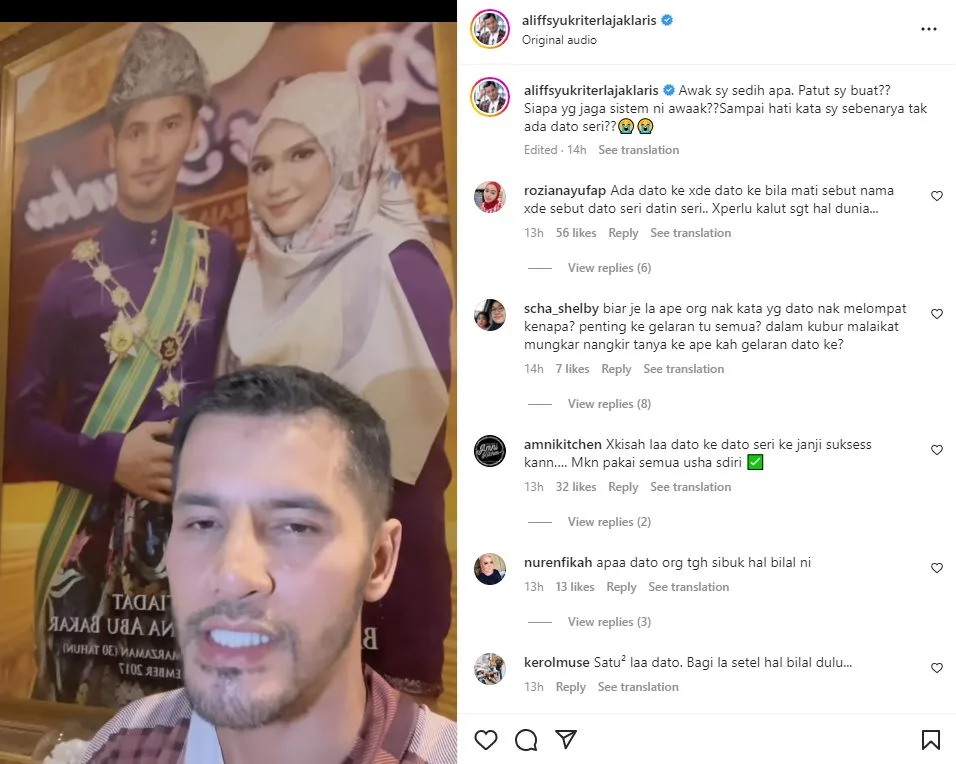 Usahawan kosmetik, Datuk Seri Aliff Syukri tampil memberi penjelasan selepas terdapat pihak yang membuat pertikaian mengenai pangkat ‘Dato Seri’ yang digunakannya.