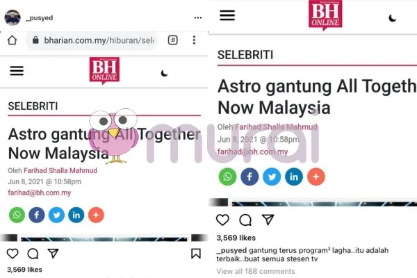 Perkongsian itu dibuat dengan memuatnaik screenshot foto dari Berita Harian, yang memaparkan mengenai isu penggantungan program All Together Now Malaysia di akaun Instagramnya hari ini.