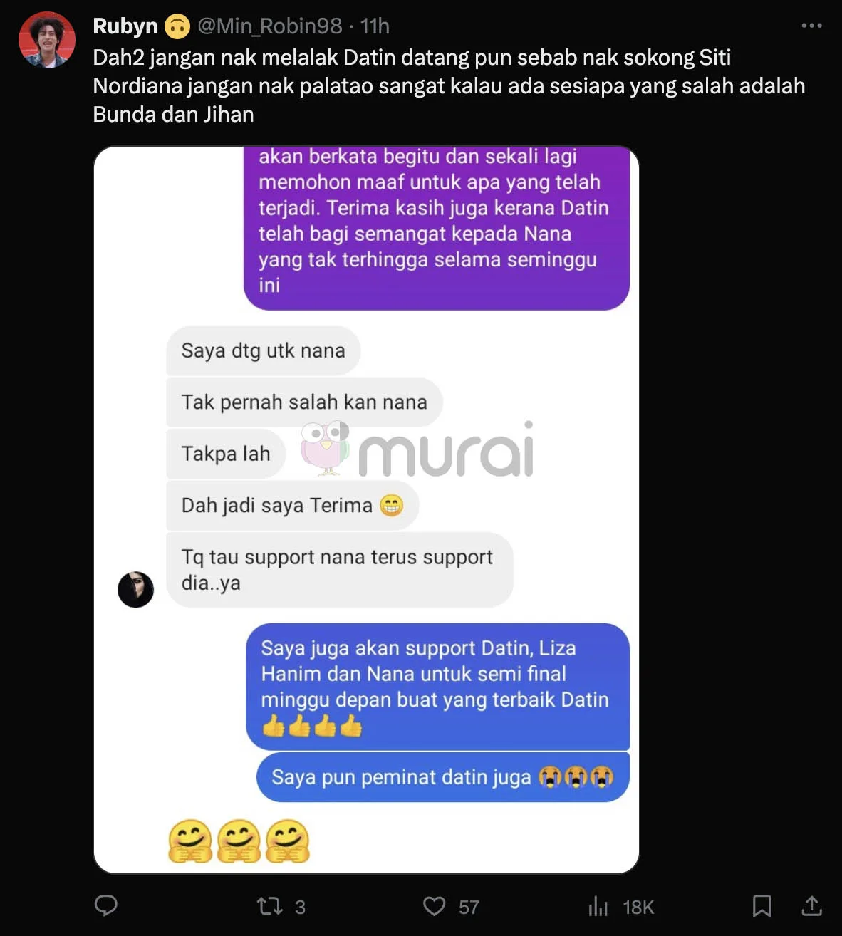 “Saya datang untuk Nana, Tak pernah salahkan Nana. Tak mengapalah, dah jadi, saya terima. Terima Kasih kerana sokong Nana dan teruskan ya..”- balas Nana.