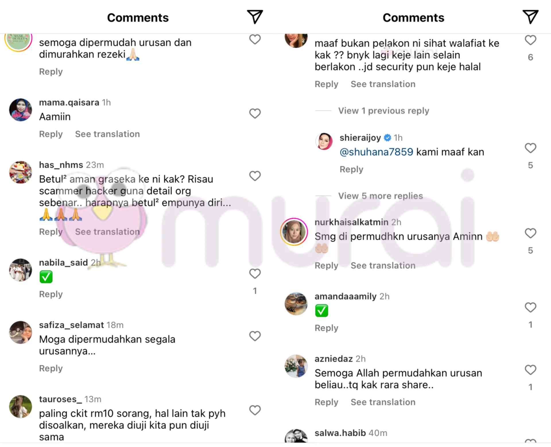 Meskipun ada yang mempertikaikan tindakan pelakon senior berkenaan. rata-rata netizen di ruangan komen dilihat menitipkan doa agar urusan Aman Graseka berjalan dengan lancar.