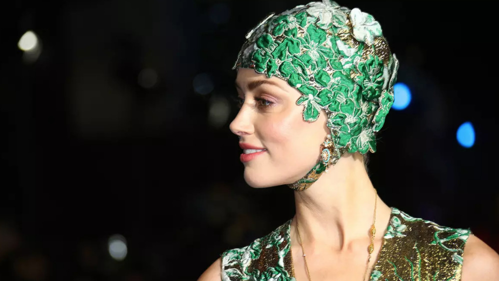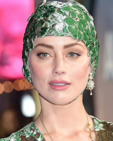 Amber Heard mengenakan gaun couture dan hiasan di kepala yang agak unik. Amber terlihat sangat memukau dengan memakai gaun hijau keemasan dari Velentino. Kalung emas panjang dan stiletto metalik melengkapi penampilannya. Unik kan? Apa komen anda?