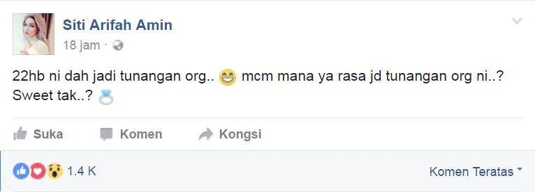 Status terkini di Facebook milik Siti Arifah Amin menguatkan lagi desas-desus yang dia bakal menjadi tunangan Hafiz Hamidun