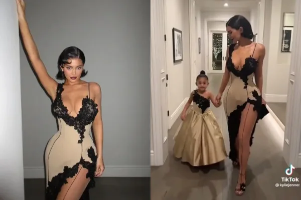 Kylie yang berkongsi gambar OOTD mereka, mengenakan gaun hitam emas yang sepadan dengan Stormi. Tetapi gaun Kylie sendiri diperincikan dengan manik hitam, belahan skin-barring dan garis leher yang menjunam, menampakkan lagi keseksiannya.
