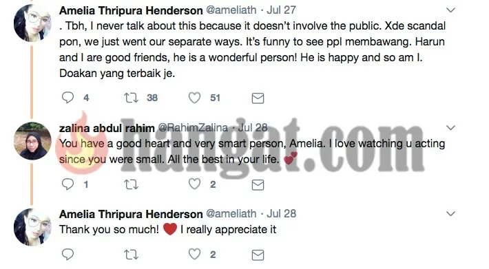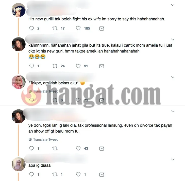 Baru-baru ini juga seorang pengguna Twitter telah memuat naik kenyataan dengan mendakwa bekas suami itu kini sedang bercinta dengan gadis lain. Melihatkan pada spekulasi tersebut,ada yang menganggap sikap bekas suaminya itu seperti sampah dan Amelia lebih berhak mendapat seorang lelaki yang jauh lebih baik.