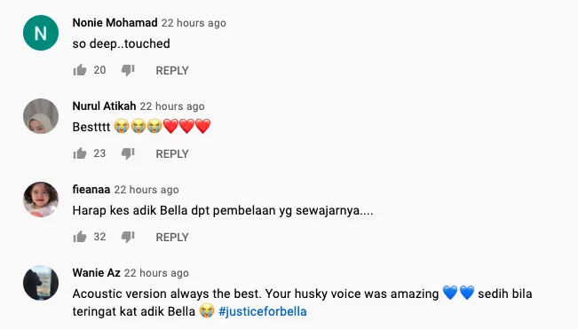Rata-rata pendengar di laman Youtube akui sedih mendengar setiap bait lagu yang disampaikan. Ada juga memuji nyanyian Amir yang cukup menyentuh hati lagi-lagi mengenangkan nasib adik Bella.
