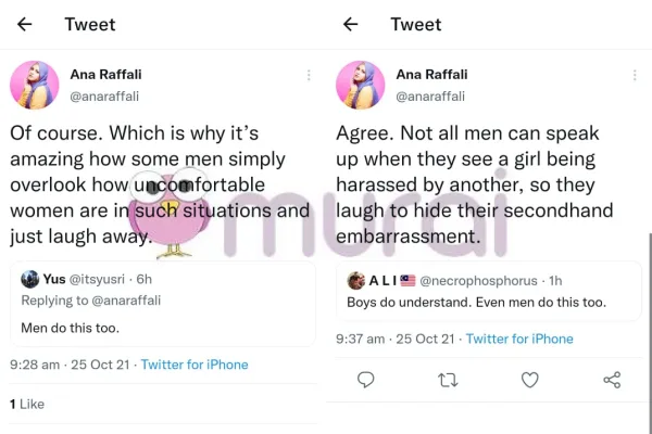 Mendapat maklumbalas dari warganet tersebut, Ana Raffali setuju lelaki juga menggunakan kaedah yang sama seperti wanita tapi belum tentu lelaki mampu bersuara jika lihat wanita diganggu oleh orang lain.