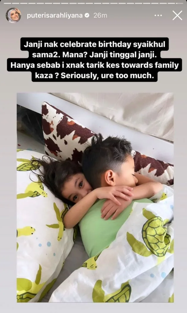 Pada hantaran sama, Sarah turut berkongsi sekeping foto memperlihatkan kedua-dua anaknya, Syaikhul dan Sumayyah sedang baring sambil berpelukan.