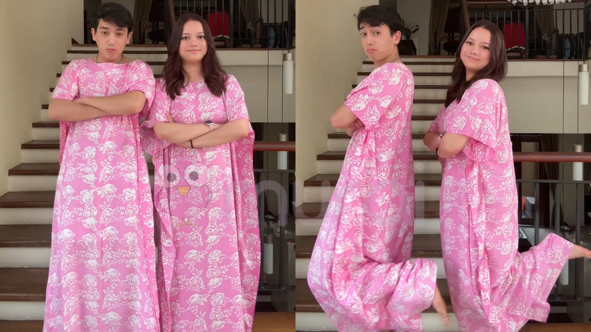 Leona, menerusi video yang dimuatnaik di TikTok memaparkan dirinya bersama Rees melakukan trend TikTok bersama sambil menggayakan baju kelawar berwarna merah jambu jenama perniagaan milik Leona iaitu Mekna.