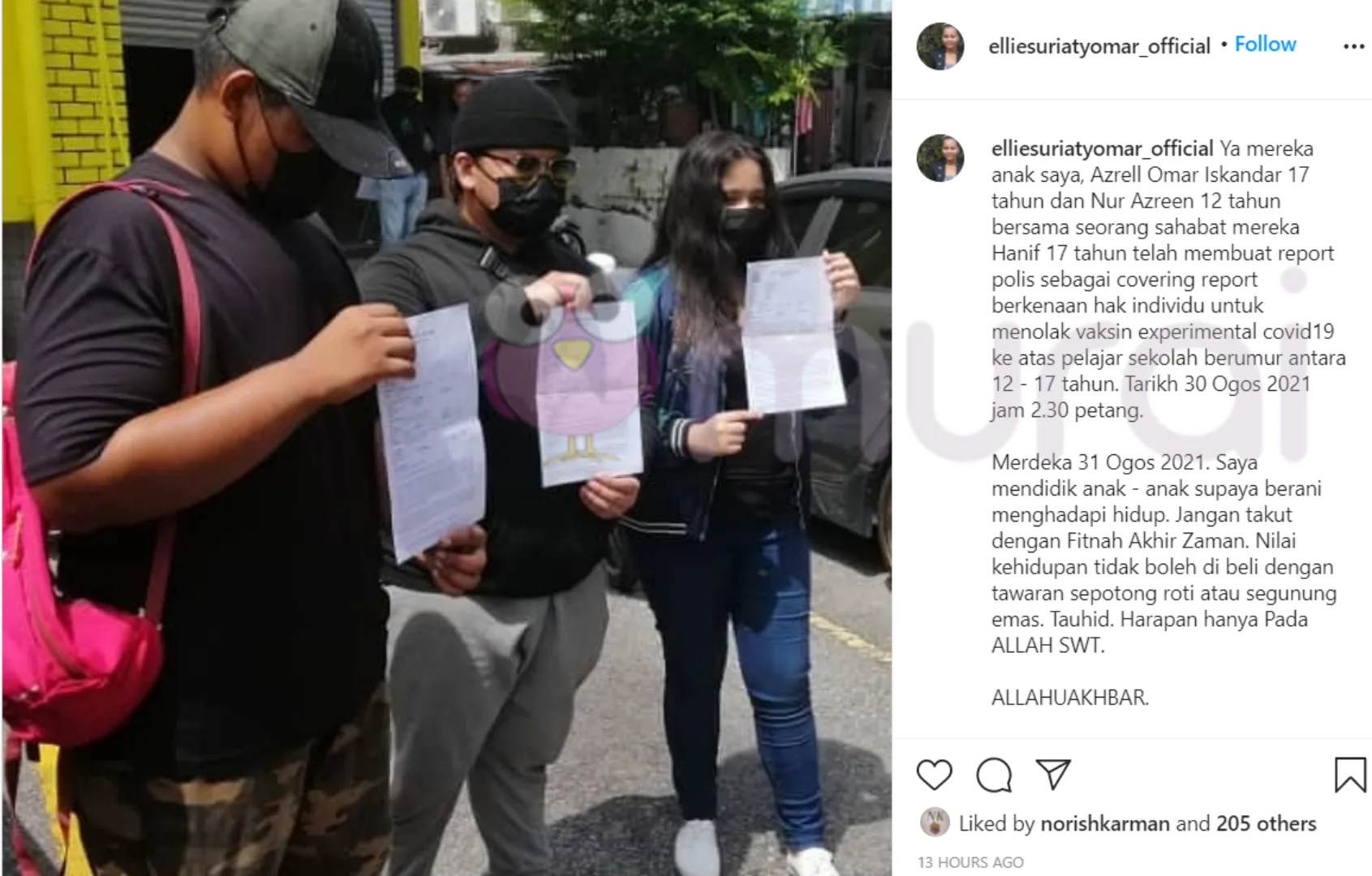 “Ya mereka anak saya, Azrell Omar Iskandar 17 tahun dan Nur Azreen 12 tahun bersama Hanif 17 tahun telah membuat laporan polis sebagai covering report berkenaan hak individu untuk menolak vaksin experimental covid19 ke atas pelajar sekolah berumur antara 12-17 tahun. Tarikh 30 Ogos 2021 jam 2.30 petang.”- dedah Ellie