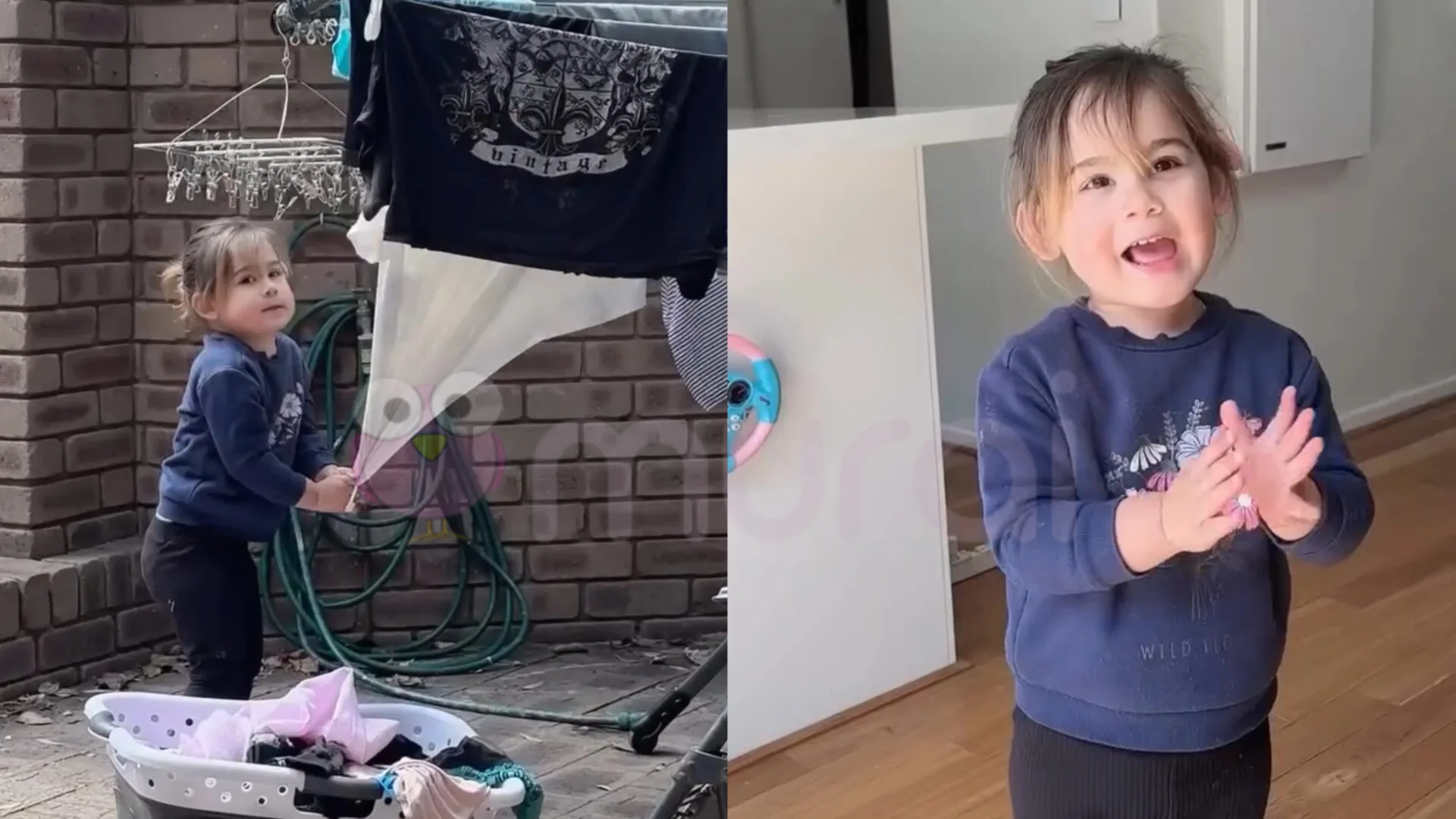 Pelakon, Raja Ilya berkongsi gelagat comel puteri sulungnya, Talita Love Garrett yang sibuk mengangkat kain jemuran, baru-baru ini.