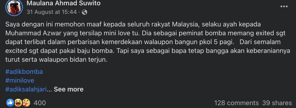 Bapa kepada budak lelaki yang mengangkat jari tengahnya yang sepatutnya buat ‘mini love’ kepada orang ramai semasa perarakan Hari Kebangsaan ke-65 telah memohon maaf atas kesilapannya.