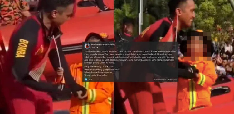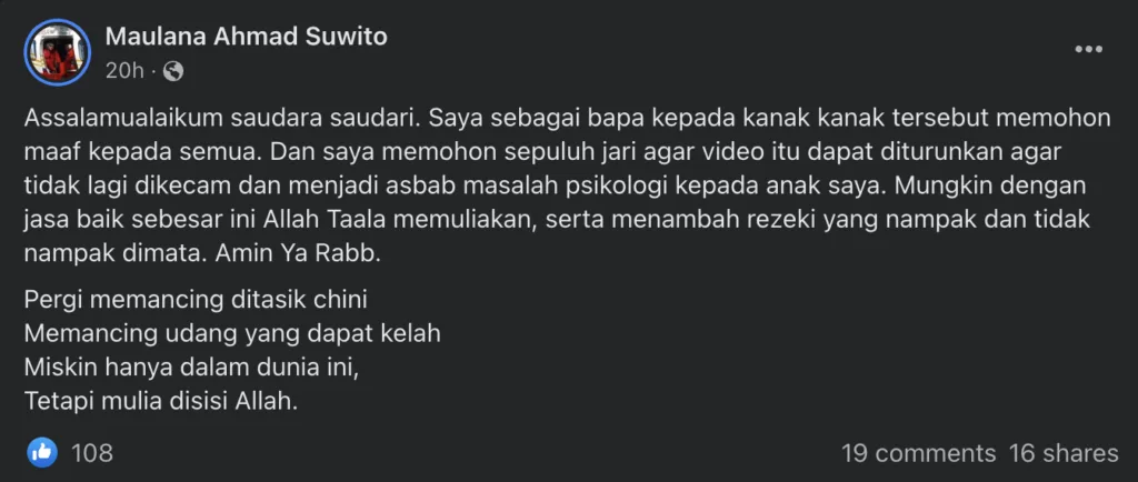 “Assalamualaikum saudara saudari. Saya sebagai bapa kepada kanak kanak tersebut memohon maaf kepada semua. Dan saya memohon sepuluh jari agar video itu dapat diturunkan agar tidak lagi dikecam dan menjadi asbab masalah psikologi kepada anak saya. Mungkin dengan jasa baik sebesar ini Allah Taala memuliakan, serta menambah rezeki yang nampak dan tidak nampak dimata. Amin Ya Rabb.
