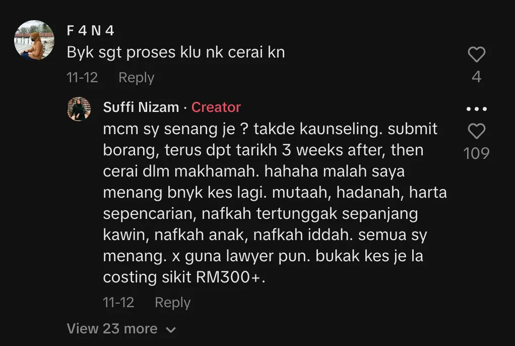 “Macam saya senang je? Takde kaunseling pun. Submit borang, terus dapat tarikh 3 minggu selepas itu, then cerai dalam mahkamah. Hahaha. Malah saya menang banyak kes lagi — mutaah, hadanah, harta sepencarian, nafkah tertunggak sepanjang kahwin, nafkah anak, nafkah iddah. Semua saya menang. Tak guna lawyer pun. Bukak kes je la, costing sikit RM300+.”
