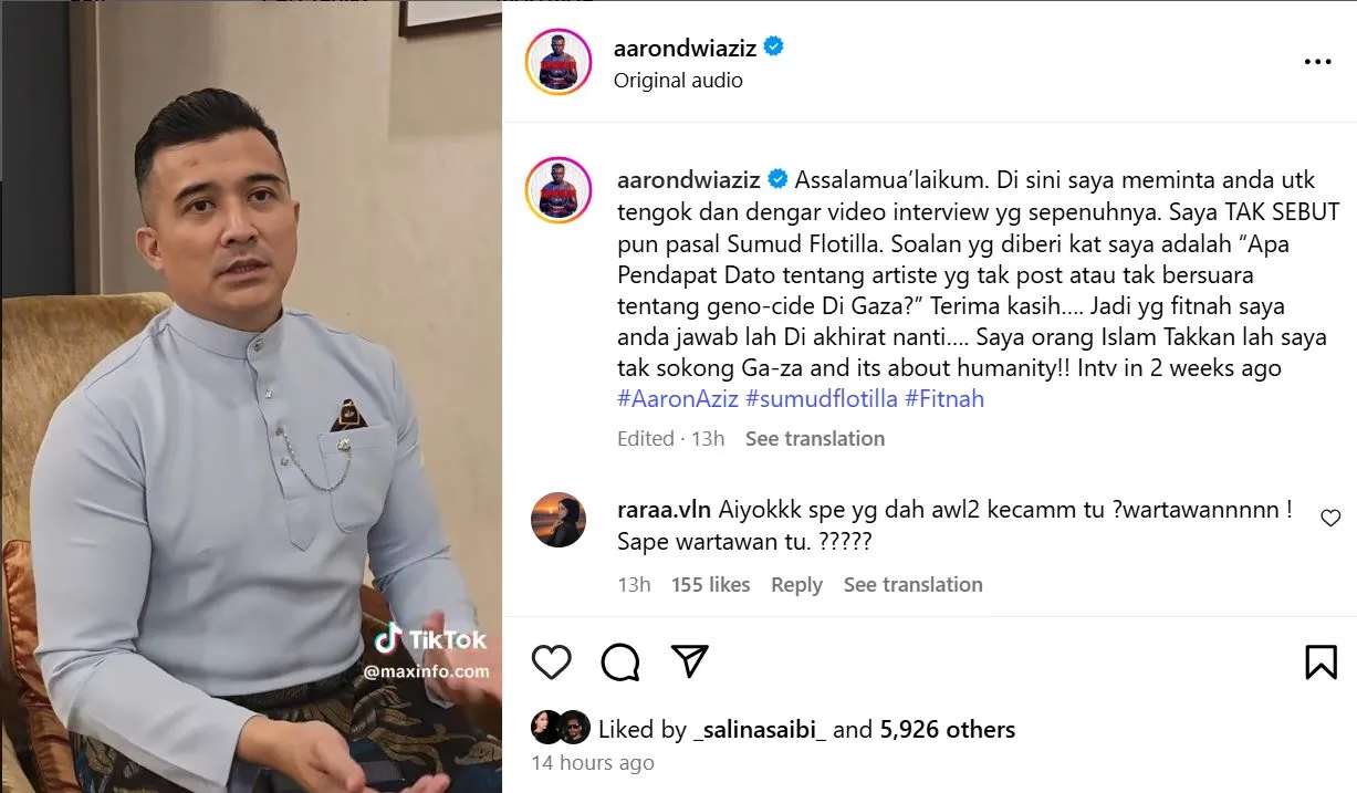 Sehubungan dengan itu, Aaron Aziz tampil menjelaskan salah faham yang timbul susulan tularnya satu klip temu bual yang didakwa menyentuh isu misi kemanusiaan Global Sumud Flotilla (GSF).
