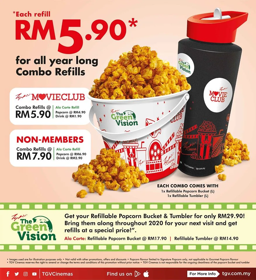 Caranya, hanya perlu membawa kedua-dua popcorn busket dan tumbler tersebut bagi setiap kali ingin membuat pengisian semula.Namun begitu, perlu diingatkan untuk setiap pengisian semula akan dicaj sebanyak RM5.90 dan tersedia untuk Hollywood Popcorn sahaja. Bagi tujuan pembelian ‘bucket’ dan ‘tumbler’ yang berharga RM29.90 ini akan tamat pada 29 Februari 2020 namun pengisian semula diadakan sepanjang tahun.