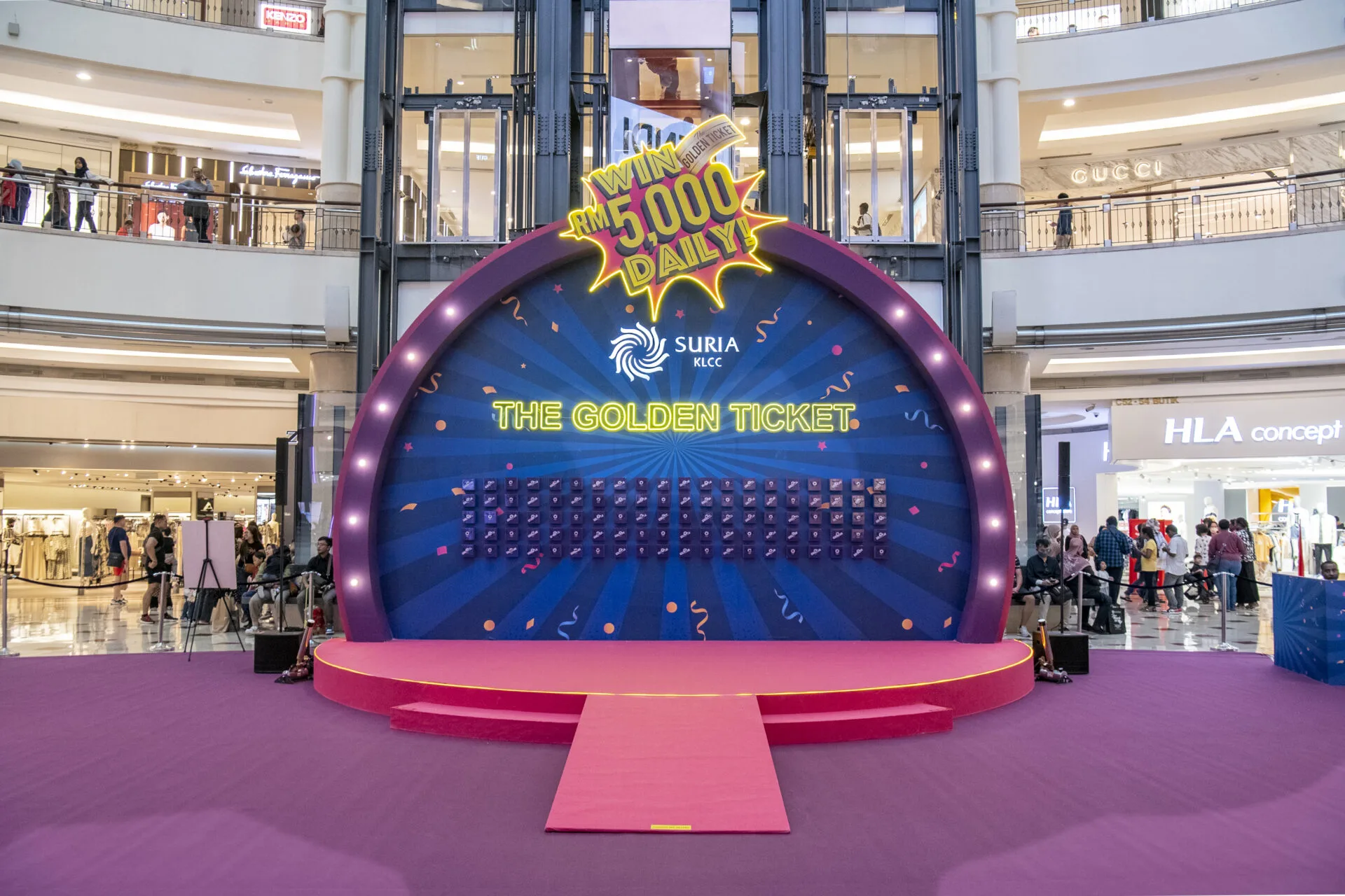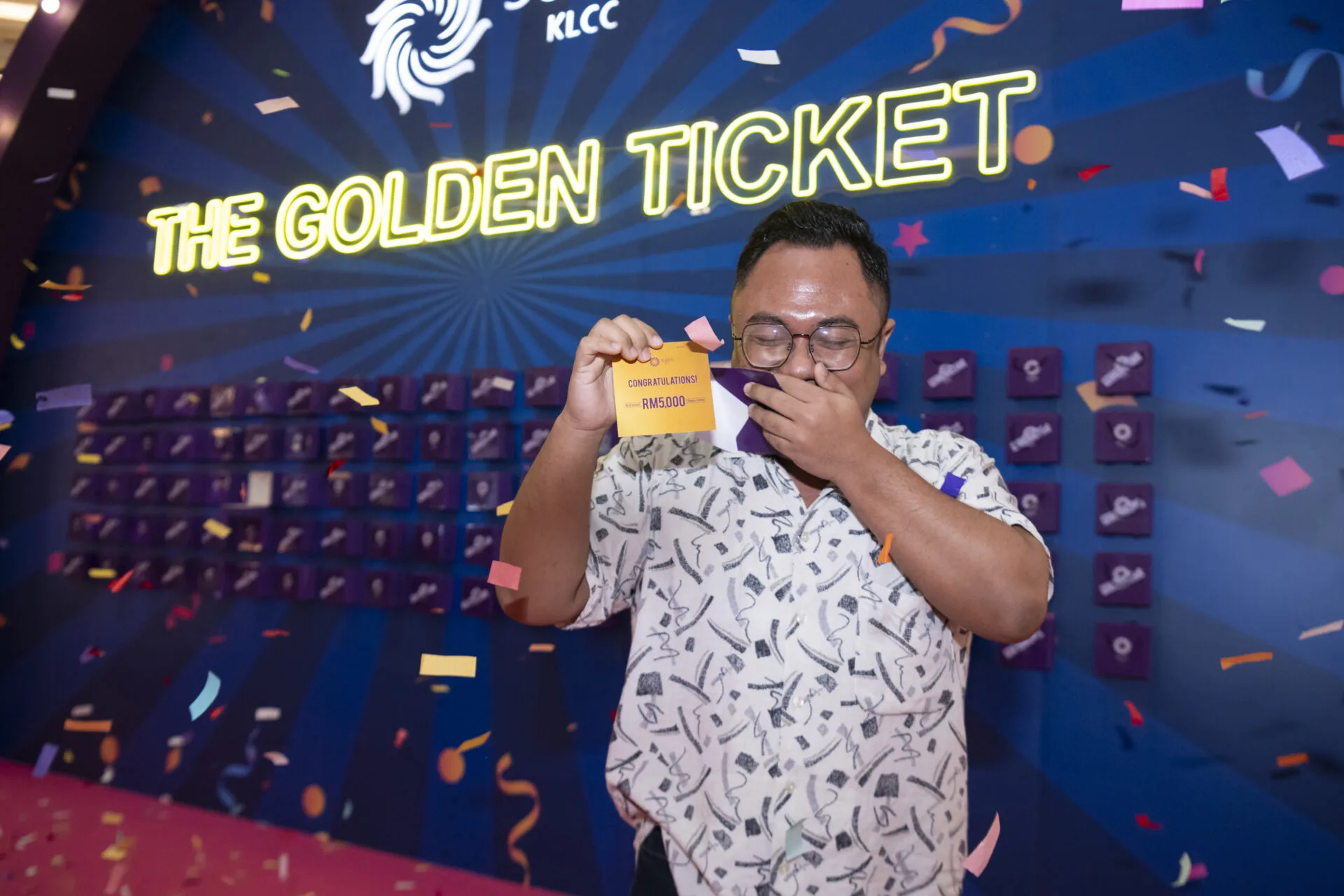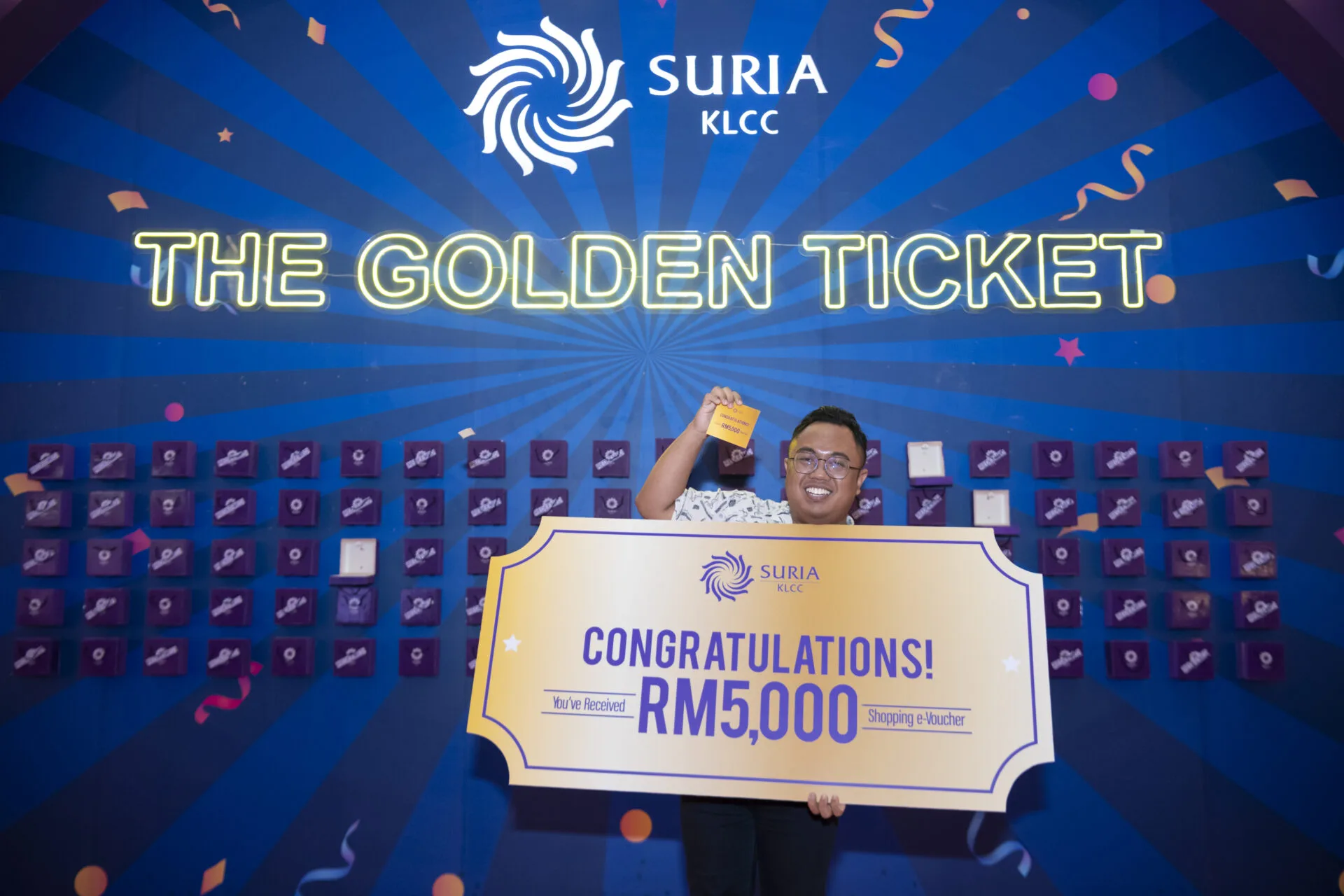 Acara tebusan ‘Golden Ticket’ akan berlangsung di Suria KLCC ‘Centre Court’ yang mana 100 kotak misteri akan tersedia untuk aktiviti cabutan bertuah buat para pelanggan. Setiap kotak mengandungi sekeping ‘Golden Ticket’ yang bernilai RM5,000 atau sekeping ‘Purple Ticket’ yang bernilai RM50.