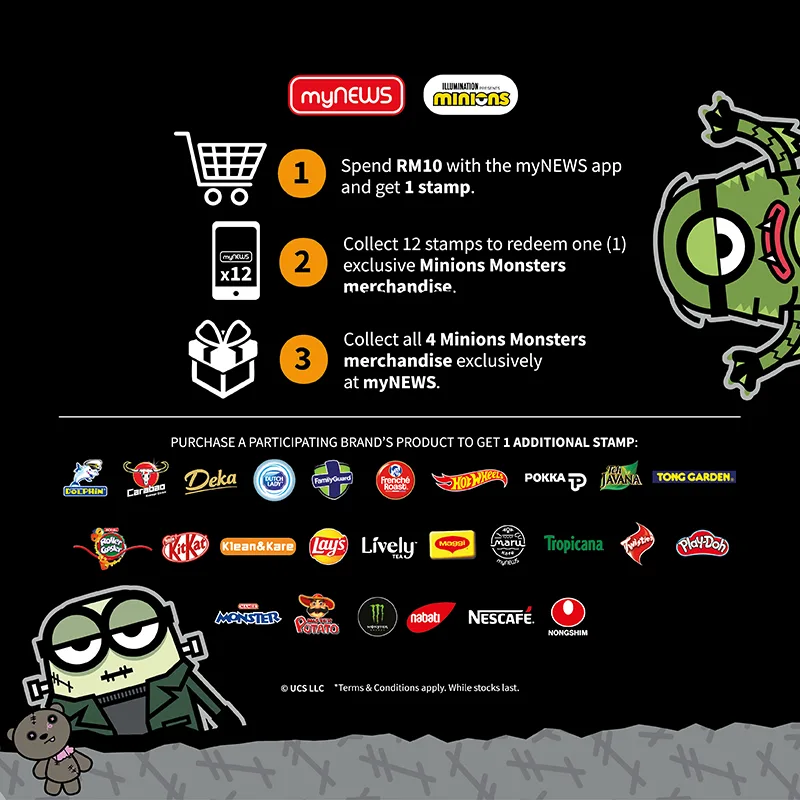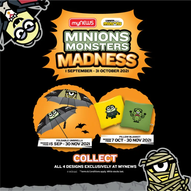 Menampilkan gabungan dari Illumination’s Minions dan Universal Classic Monsters, empat watak Minion Monsters yang unik hanya tersedia untuk masa terhad di myNEWS di seluruh Malaysia.