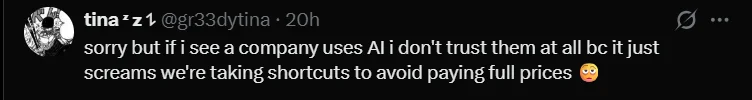 Ada yang menyatakan hilang kepercayaan terhadap syarikat yang terlalu bergantung kepada AI kerana dilihat mengambil jalan mudah untuk mengurangkan kos tenaga manusia.