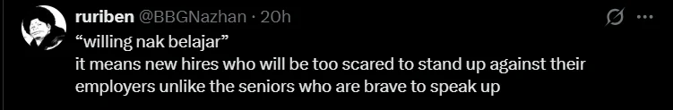 Frasa “willing to learn” turut menjadi perdebatan apabila sebahagian warganet mentafsirkannya sebagai kecenderungan majikan mengambil pekerja muda yang kurang berani bersuara soal gaji dan kebajikan.