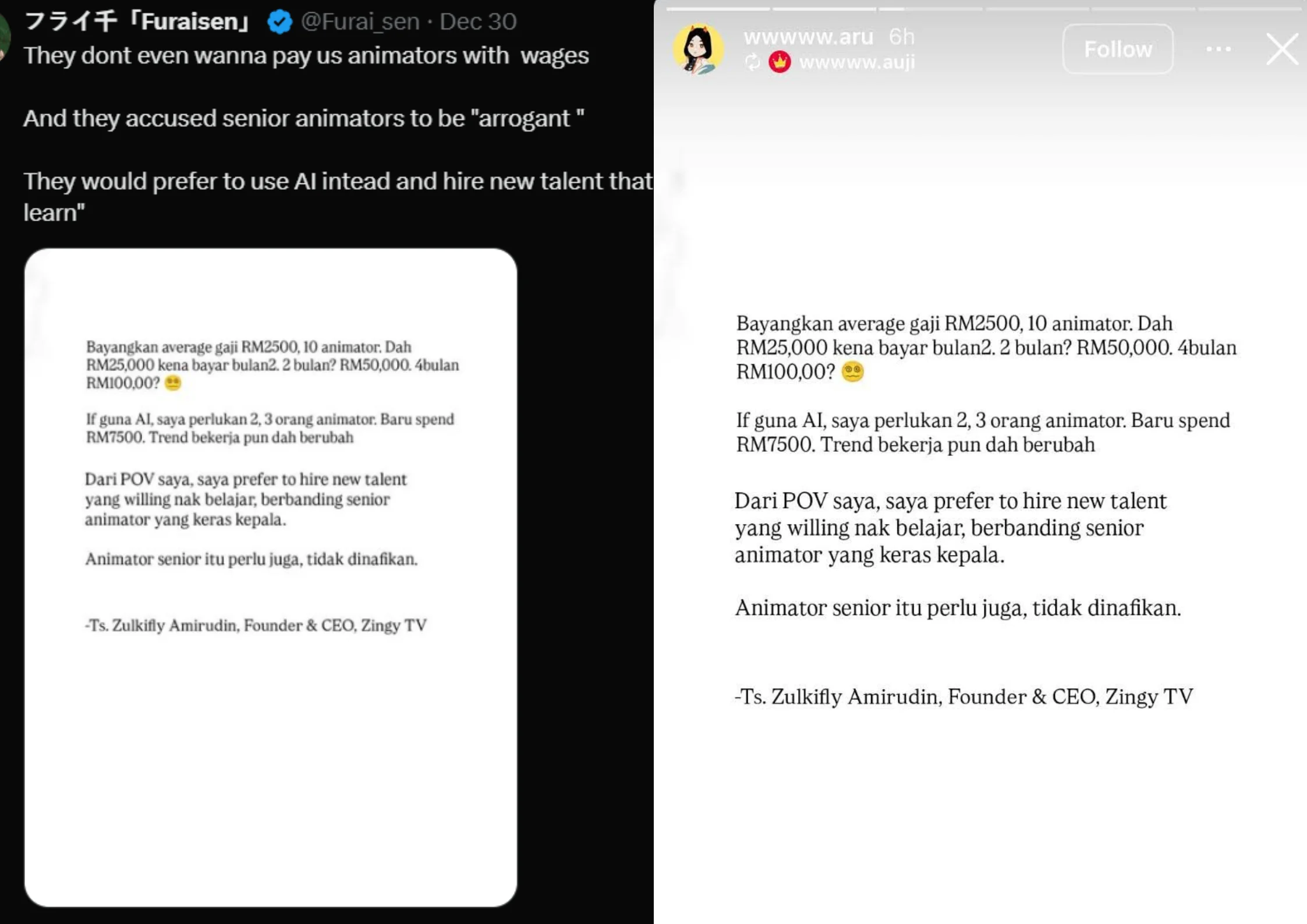Satu perkongsian di Instagram Story milik akaun wwwww.aru baru-baru ini mencetuskan perbualan hangat dalam kalangan penggiat industri animasi tempatan apabila memetik pandangan Founder & CEO Zingy TV, Ts. Zulkifly Amirudin, berhubung kos pengambilan animator dan penggunaan teknologi AI.