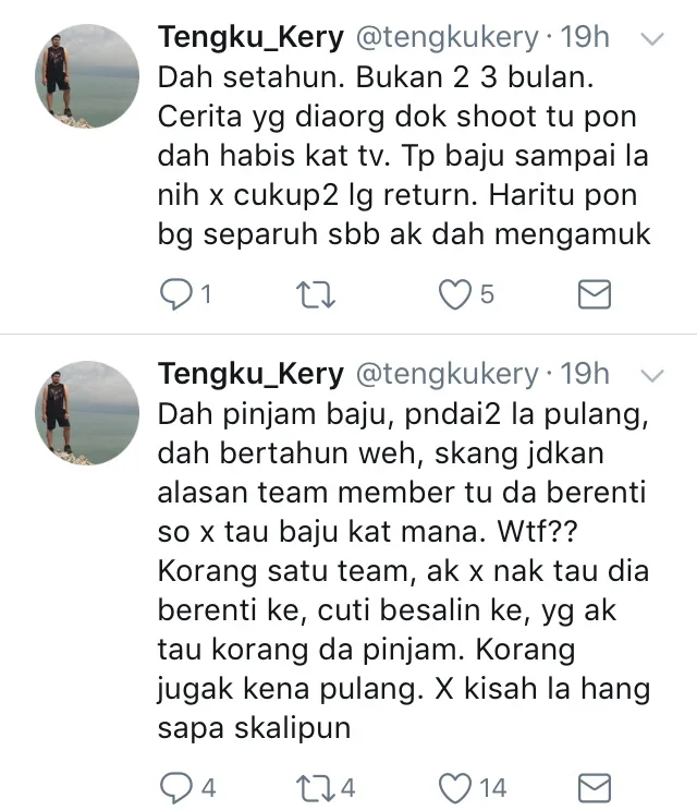 Menurut pemilik jenama Tuan, Tengku Kery atau lebih mesra disapa sebagai Kery pada murai.my, beliau merasa terkilan kerana baju-baju yang telah dipinjamkannya pada produksi tersebut tidak dipulangkan sehingga ke hari ini malah ianya sudah berlanjutan hampir setahun lamanya.