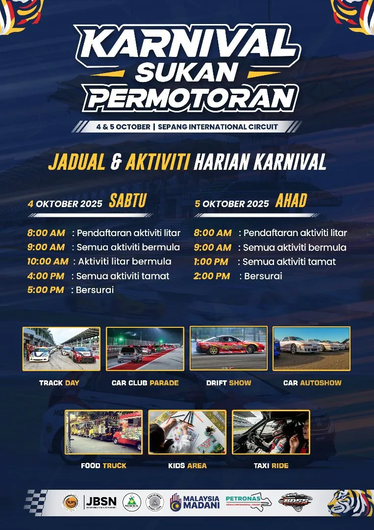 Nak rasa naik kereta lumba pecut kat Sepang? Ada Taxi Ride, tapi jangan pula mintak driver berhenti kat R&R Serdang beli air soya. Ada juga Track Day kalau kalian teringin belajar jadi ‘Fast & Furious versi Mesra Mall’. Lagi best, ada Drift Show. Ditambah pula dengan Car Club Parade & Autoshow, penuh kereta rare, dari klasik sampai JDM. Jangan pelik kalau nampak kereta lebih mahal dari rumah sendiri.