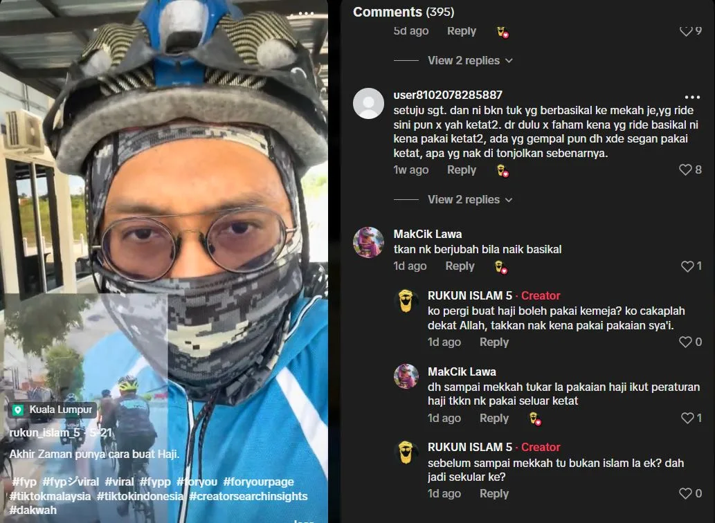 Dalam video tersebut, pemilik akaun berkenaan menegur secara terbuka tindakan sesetengah individu yang berhasrat menunaikan ibadah haji atau umrah dengan menaiki basikal, namun tidak menjaga etika berpakaian selaras dengan tuntutan Islam.