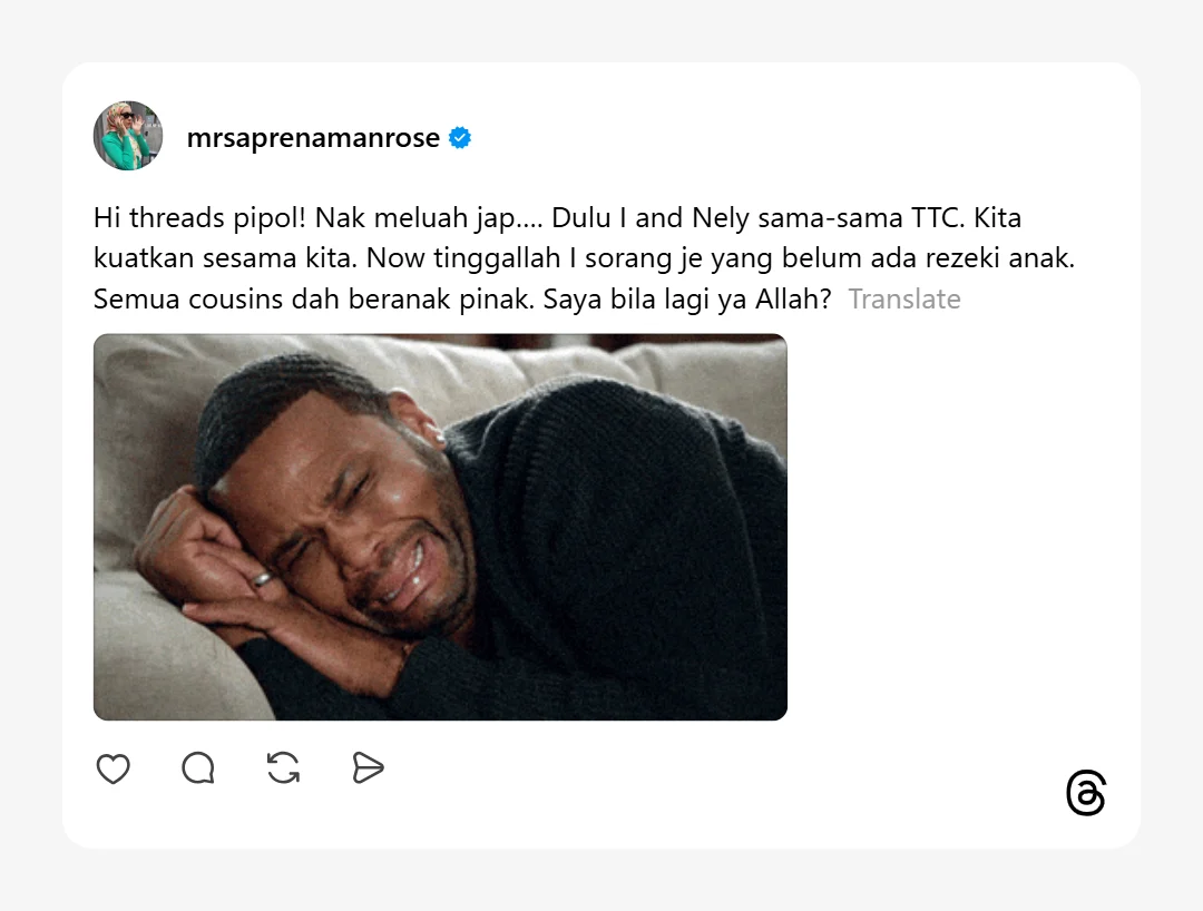 “Nak meluah kejap. Dulu saya dan Nely sama-sama TTC. Kita kuatkan sesama kita. Sekarang tinggalkan saya seorang je yang belum ada rezeki anak. Semua sepupu dah beranak-pinak, saya bila lagi ya Allah?.”-luah Aprena di Threads