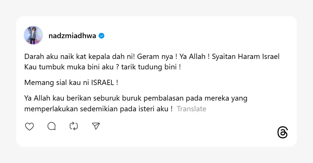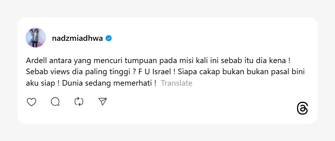 “Ardell antara yang mencuri tumpuan pada misi kali ini sebab itu dia kena! Sebab views dia paling tinggi? F**k you Israhell! Siapa cakap bukan-bukan pasal bini aku siap! Dunia sedang memerhati!!”-tulis Nadzmi di Thread