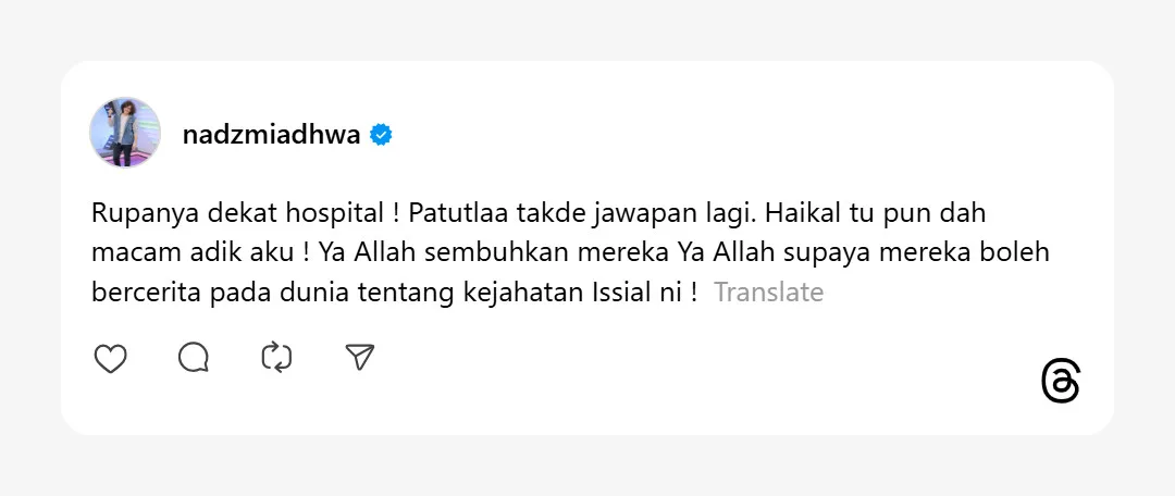 “Rupanya dekat hospital! Patutlaa takde jawapan lagi. Haikal tu pun dah macam adik aku! Ya Allah sembuhkan mereka Ya Allah supaya mereka boleh bercerita pada dunia tentang kejahatan Israhell ni!.