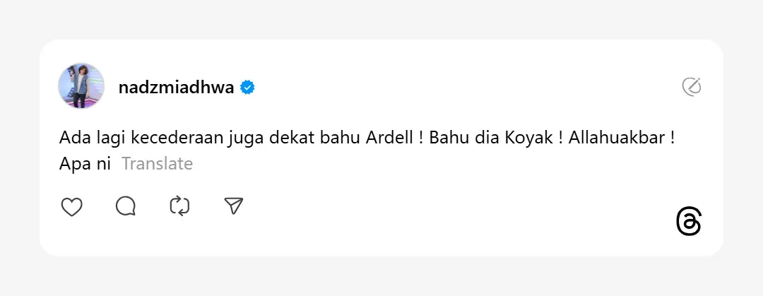 Ada lagi kecederaan juga dekat bahu Ardell! Bahu dia koyak! Allahuakbar! Apa ni.”-tulis Nadzmi lagi