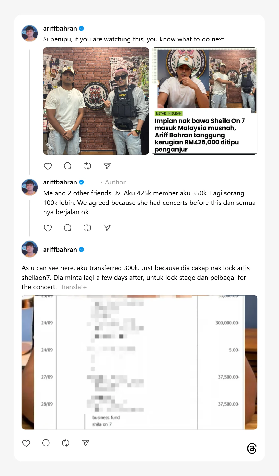 “Saya Ariff Bahran dan rakan-rakan saya terlibat dalam kes penipuan sebanyak RM425,000. Penganjur acara sepatutnya bawa Sheila On 7 datang ke Malaysia pada tahun lepas untuk adakan satu konsert, tetapi last-last gagal.