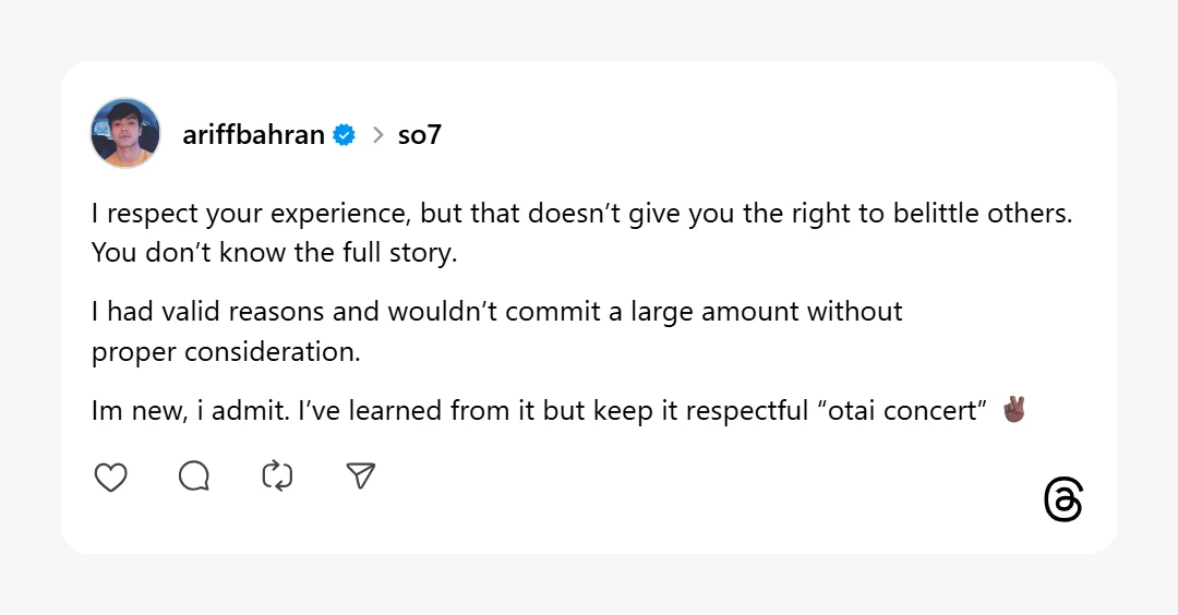 Saya masih baru, saya mengakui itu. Saya telah mempelajarinya tapi kekalkan rasa hormat, ‘otai konsert’.”tulis Ariff lagi