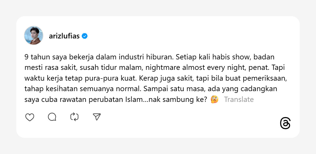 Tapi waktu kerja tetap pura-pura kuat. Kerap juga sakit, tapi bila buat pemeriksaan, tahap kesihatan semuanya normal. Sampai satu masa, ada yang cadangkan saya cuba rawatan perubatan Islam.”-kongsi Ariz di Thread.
