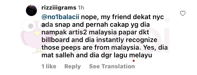 “Nope, my friend dekat nyc ada snap and pernah cakap yang dia nampak artis2 malaysia papar dekat billboard and dia instantly recognize those peeps are from Malaysia, Yes dia mat salleh and dia dengar lagu melayu”-tambah mereka