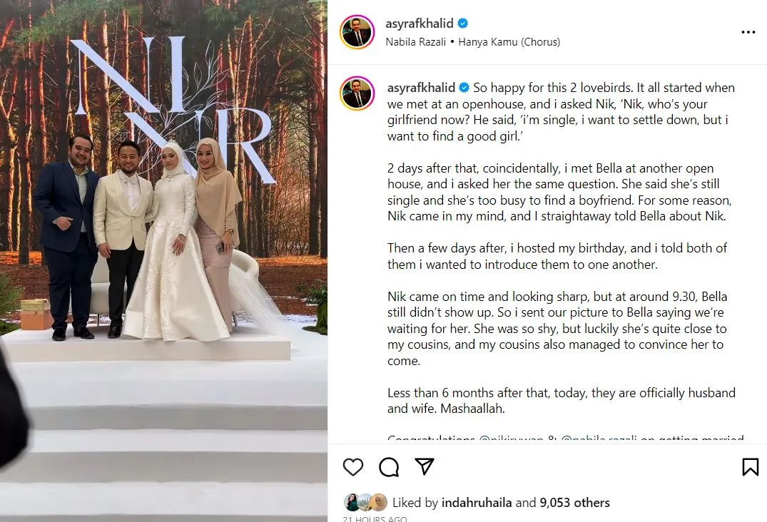 Dalam pada itu, usahawan Asyraf Khalid mendedahkan dia merupakan antara individu yang bertanggungjawab dalam menyatukan pasangan pengantin ini.
