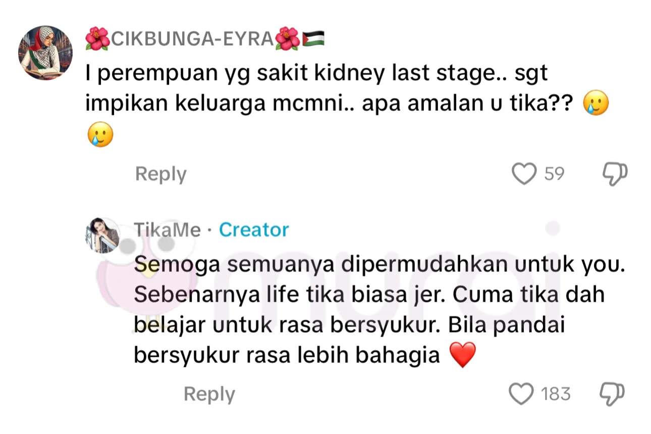 “Saya perempuan yang sakit kidney last stage. Sangat impikan keluarga macam ni. Apa amalan you, Tika?-komen seorang netizen