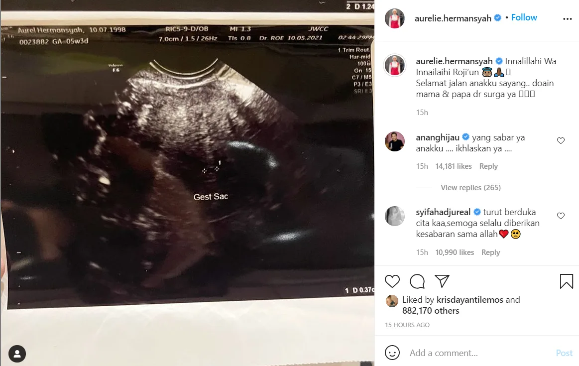 Aurel Hermansyah telah memuatnaik posting di Instagram yang menunjukkan foto ultrasound keadaan janinnya yang tidak berkembang.