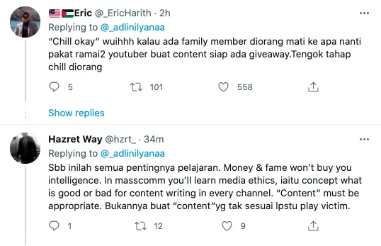 “Aku bukan nak cakap banyaklah..apa masalah korang dengan adik aku? Adik aku buat apa? Sampai korang kelam-kabut sekarang ini? Adik aku buat content (kandungan) hanya untuk pengajaran saja! Yang korang kelam kabut ini kenapa? Relaks jer, benda boleh chill!