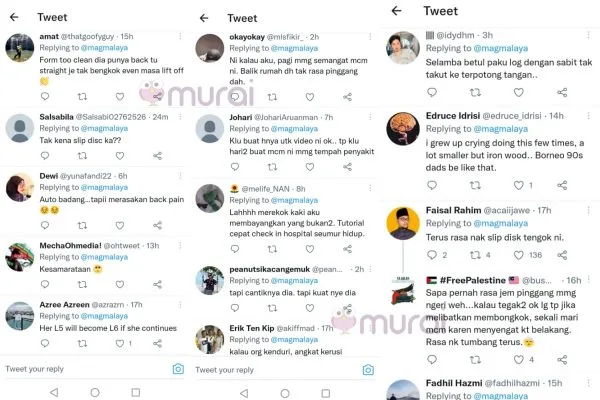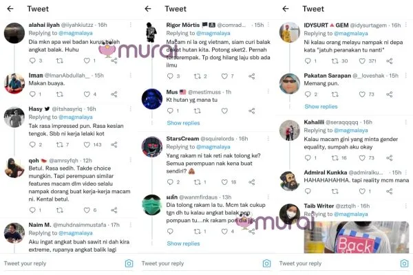 “Rasa sedih. Tak ada pilihan mungkin. Tapi perempuan serupa seperti macam dalam video selalu nampak dia orang buat kerja-kerja macam ni. Kental betul” ciap warganet