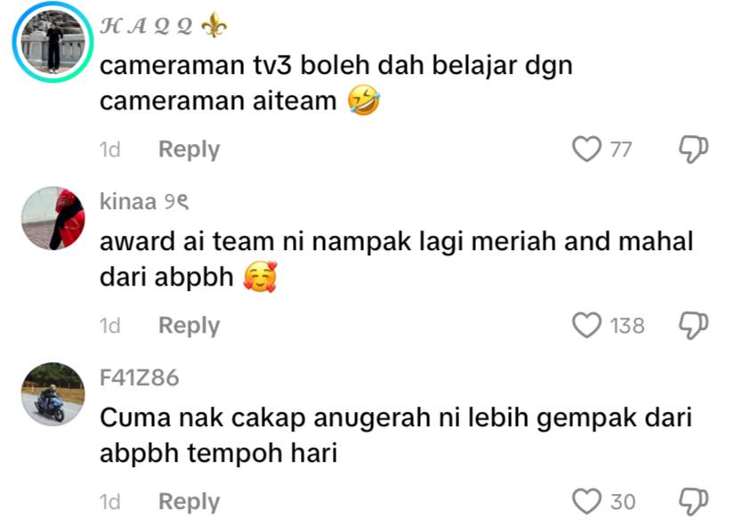 Komen netizen turut mencuri perhatian apabila rata-rata bersetuju bahawa acara anugerah Team AI dilihat lebih gempak, meriah dan dekat dengan citarasa generasi muda. Namun begitu, ada juga yang berpendapat ABPBH masih relevan, cuma perlu diberi nafas baharu agar terus kekal diminati.