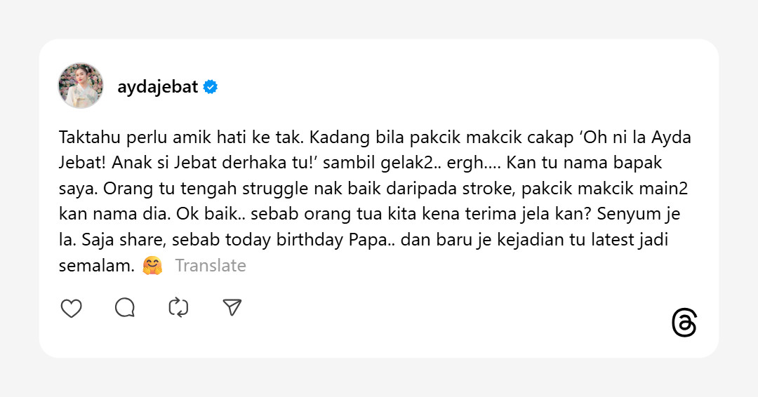 Saja share, sebab today birthday Papa, dan baru je kejadian tu latest jadi semalam.”-kongsi Ayda di Thread