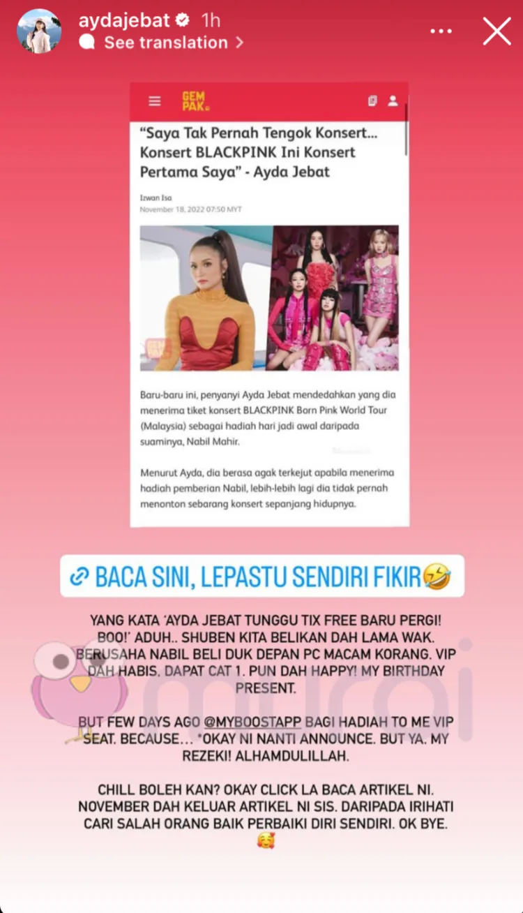 Tidak berdiam diri, Ayda menerusi Insta Stories, tampil menegaskan bahawa dia menerima tiket konsert BLACKPINK daripada suaminya sendiri, Nabil Mahir sebagai hadiah hari jadinya.