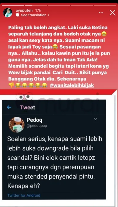 “Paling tak boleh angkat. Laki suka betina separuh telanjang dan bodoh otaknya. Asalkan seksi katanya. Suami macam ni layak jadi Mainan saja. Sesuai pasangannya.. Allahu.. Kalau kahwin pun itu je lah pun gunanya.